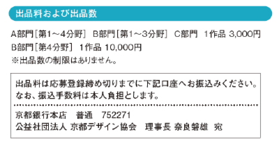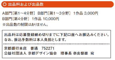 京都には1200年の歴史が培った魅力的なデザインが多数存在しています。それらは現代においても引用され、新たな作品や商品開発に繋がっています。「京都デザイン賞2015」では、京都の伝統と文化を守りながら、新たなデザイン手法を用いて、新しい京都のデザインの創出を図る作品を募集します。