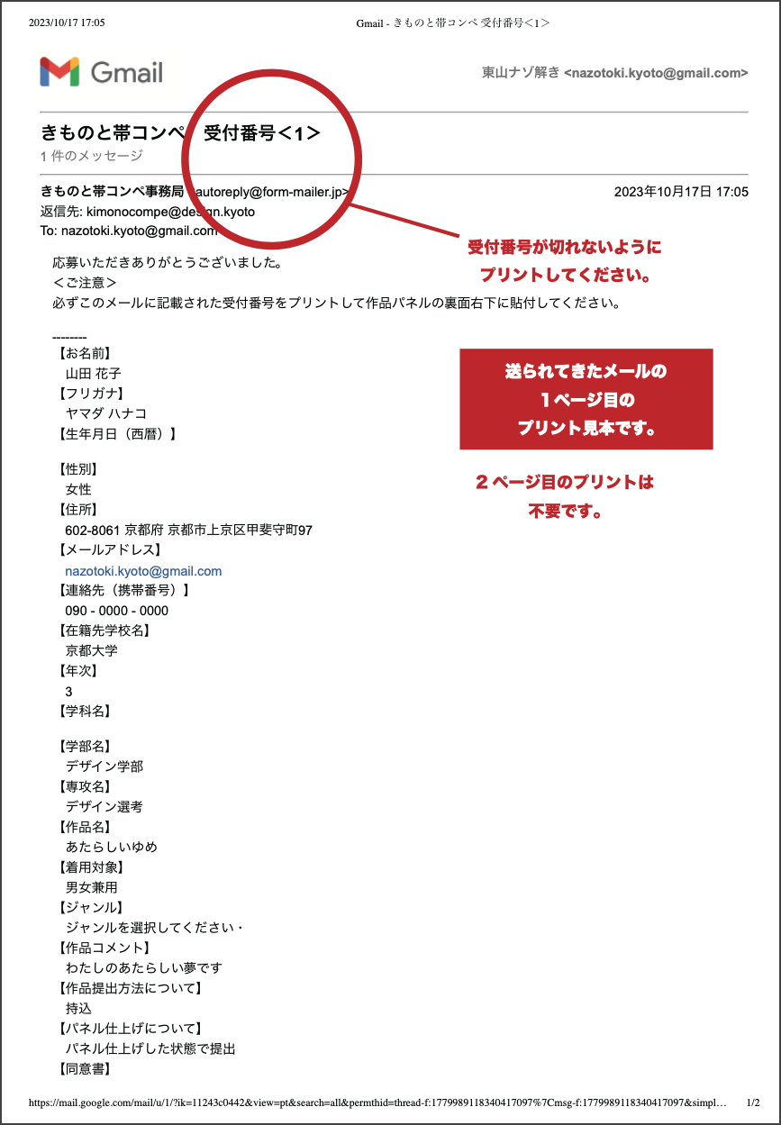 ウェブサイトもしくはフライヤーから、申込フォームによる応募受付とする。フォーム申込後、受付完了メールと共に出される「応募受付№」の記載のあるメール本文のプリントを作品裏面の右下角に貼付すること。なお、応募受付プリントの上下方向は、作品表面の上下と合わせること。