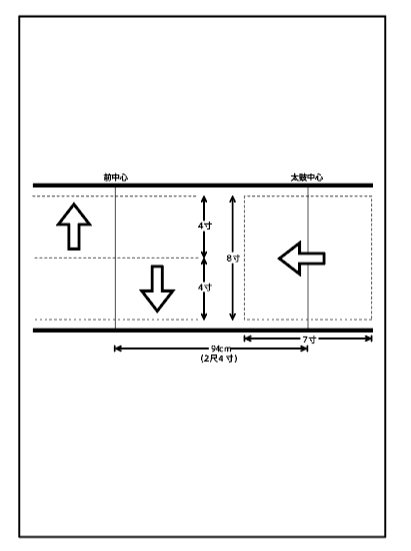 ザインには「帯(太鼓柄)の柄配置と寸法図」を例示する。