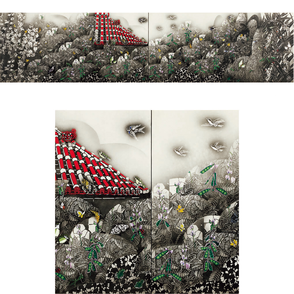 長尾 紀壽 NAGAO Norihisa 型絵染「惜別の赤瓦家(アカカーラヤ)(繁茂する花豆(ハナマメ))」 和紙、顔料/糊防染・墨・顔料・ステンシル・ドローイング パネル/各 80cm×160cm 2点組 前のページへ 次のページへ