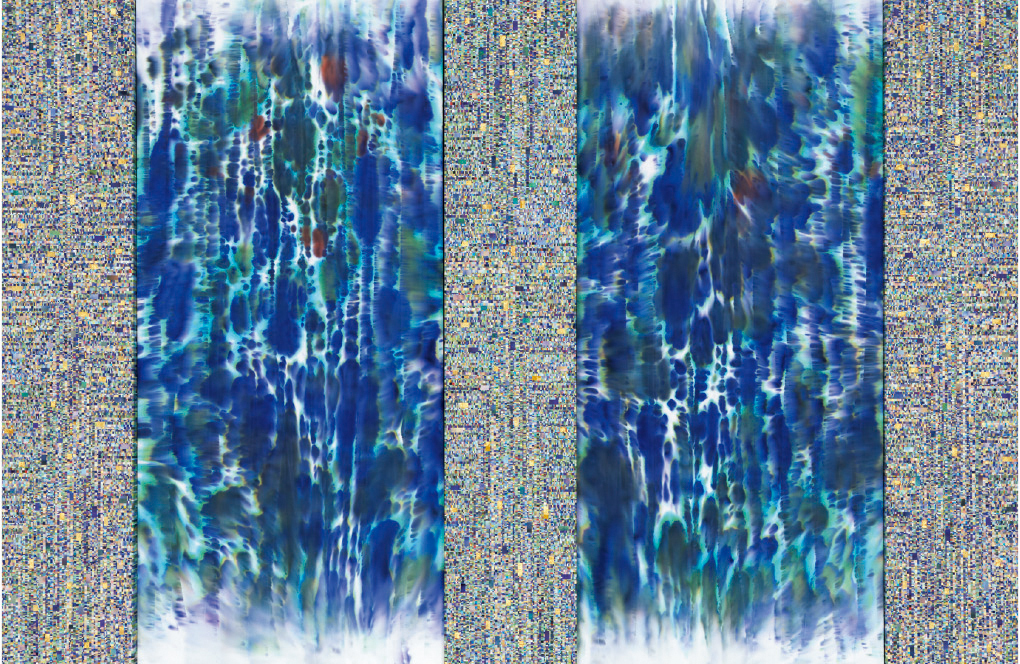 福本 繁樹 FUKUMOTO Shigeki 《エンヤーコーラヤ、ドッコイ ドッコイ ドッコイナ》 綿布、レマゾール染料/なるほど染め、布象嵌 パネル5点組/230cm×345cm×9cm 前のページへ 次のページへ