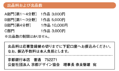 京都には1200年の歴史が培った魅力的なデザインが多数存在しています。それらは現代においても引用され、新たな作品や商品開発に繋がっています。「京都デザイン賞2015」では、京都の伝統と文化を守りながら、新たなデザイン手法を用いて、新しい京都のデザインの創出を図る作品を募集します。