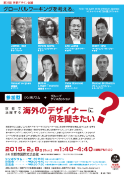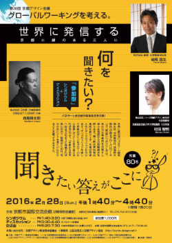 京都に縁の深いパネラー(細尾真生氏、村田智明氏、西堀耕太郎氏)が語るグローバルワーキング。第一部シンポジウムでは、各氏の仕事事例をお聴きし様々な角度からの問題解決を探ります。第二部は参加者の質問を取り上げ、会場の皆様と共にディスカッションを行います。ディスカッションを通して京都デザインをグローバルに展開していくための一助となれば幸いです。 「京都から世界へ」何をどのように発信すれば良いのか? 皆様がこの日、何らかのヒントを得ていただけることを願ってやみません。