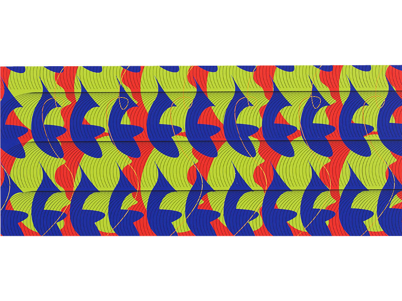 生き物の羽をモチーフに総柄の帯をデザインしました。原色を多く使っていますが、黒の連続したラインが全体を引き締める役割を果たしています。意外とどんな着物にも合わせやすいデザインだと思います。