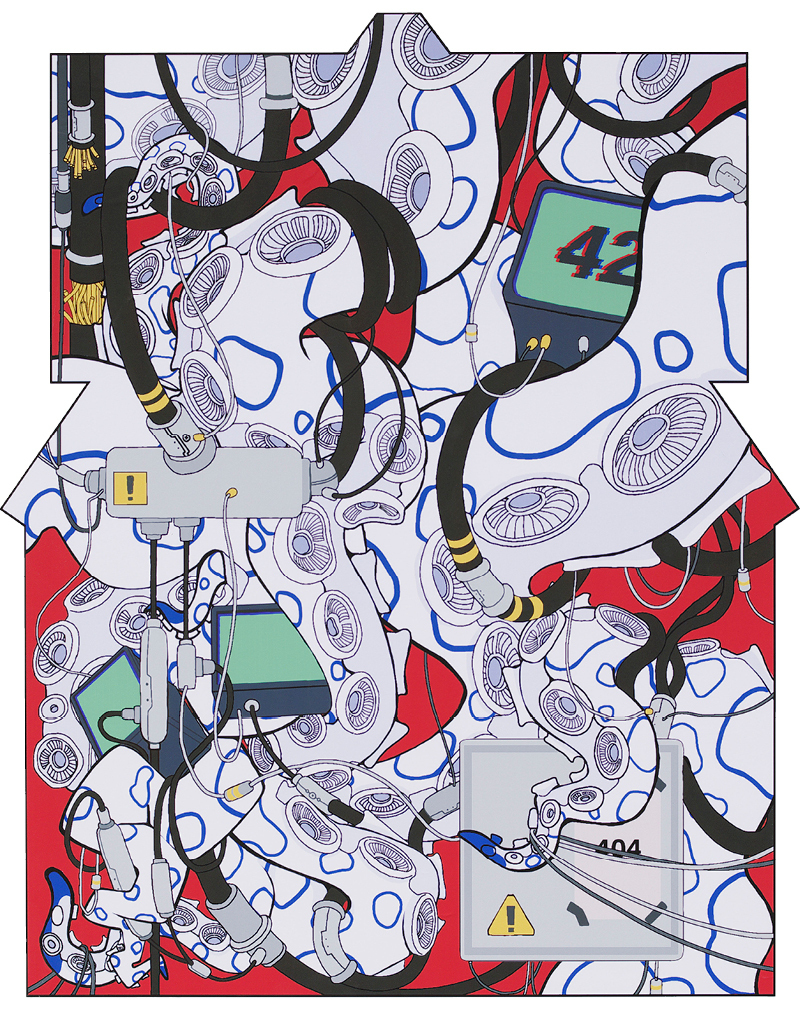 蛸と配線というダジャレからこのデザインを考えました。工夫したポイントは、着物を着用する時のことを想定したことです。柄ではバッテリーを帯や着る際見えなくなる位置に配置しました。理由として、バッテリーは機械に内蔵されており、普段目にする機会がないという点から、そのようにしました。また生物と機械という、有機質なものと無機質なものの存在を、楽しんでいただけるといいなと思いました。