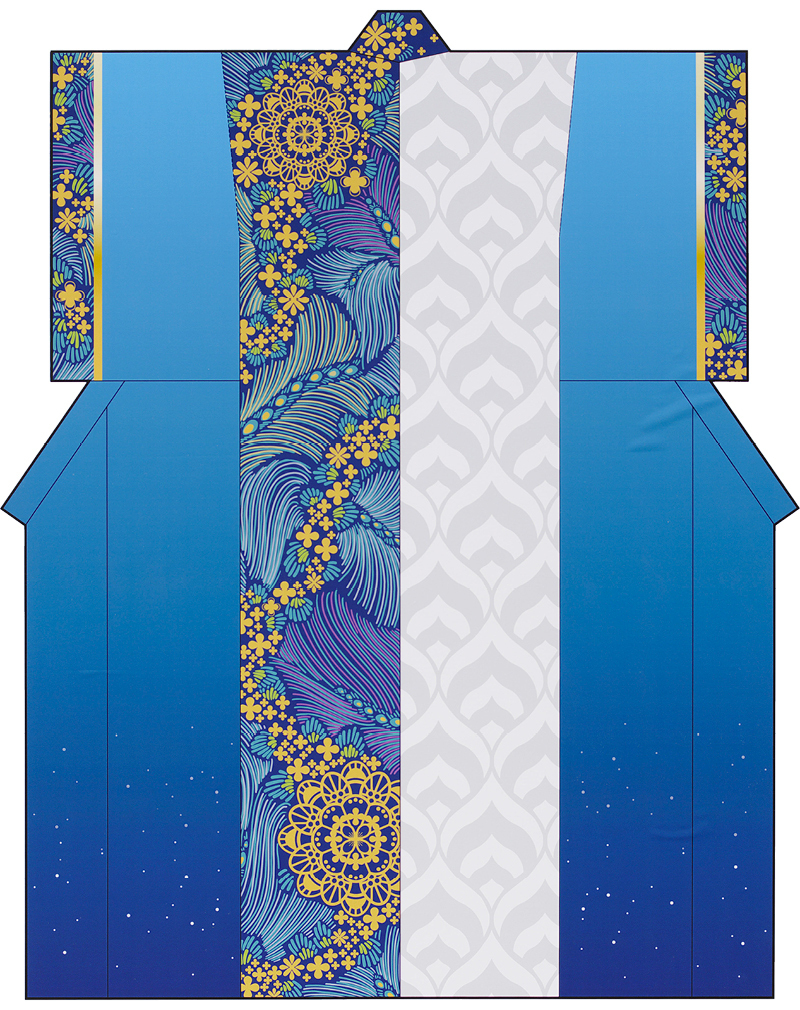 美しい青色で女性の凛とした姿を想像させると共に、片身代わりの見る向きによって変わる面白さを表現しました。