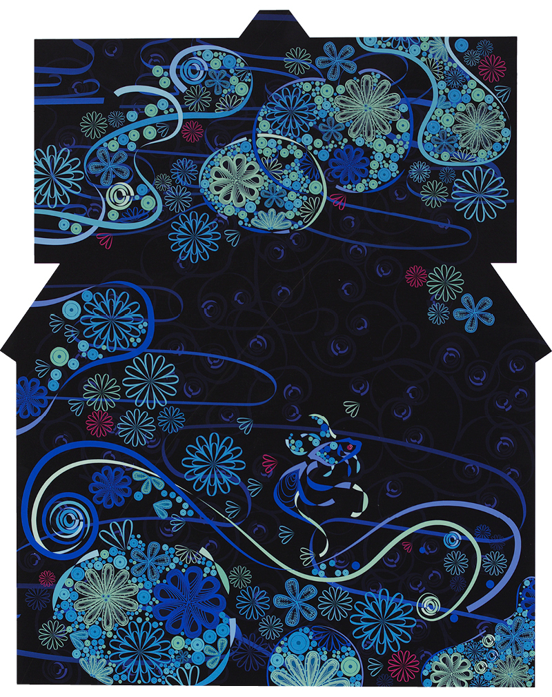 平素に纏う小紋風の柄に、風物である金魚を取り入れ、運を連れて歩くというイメージを与えた。また、配色は現代的な光を基にした。着物の繊細さを尊重しつつ、新しさを追求した。
