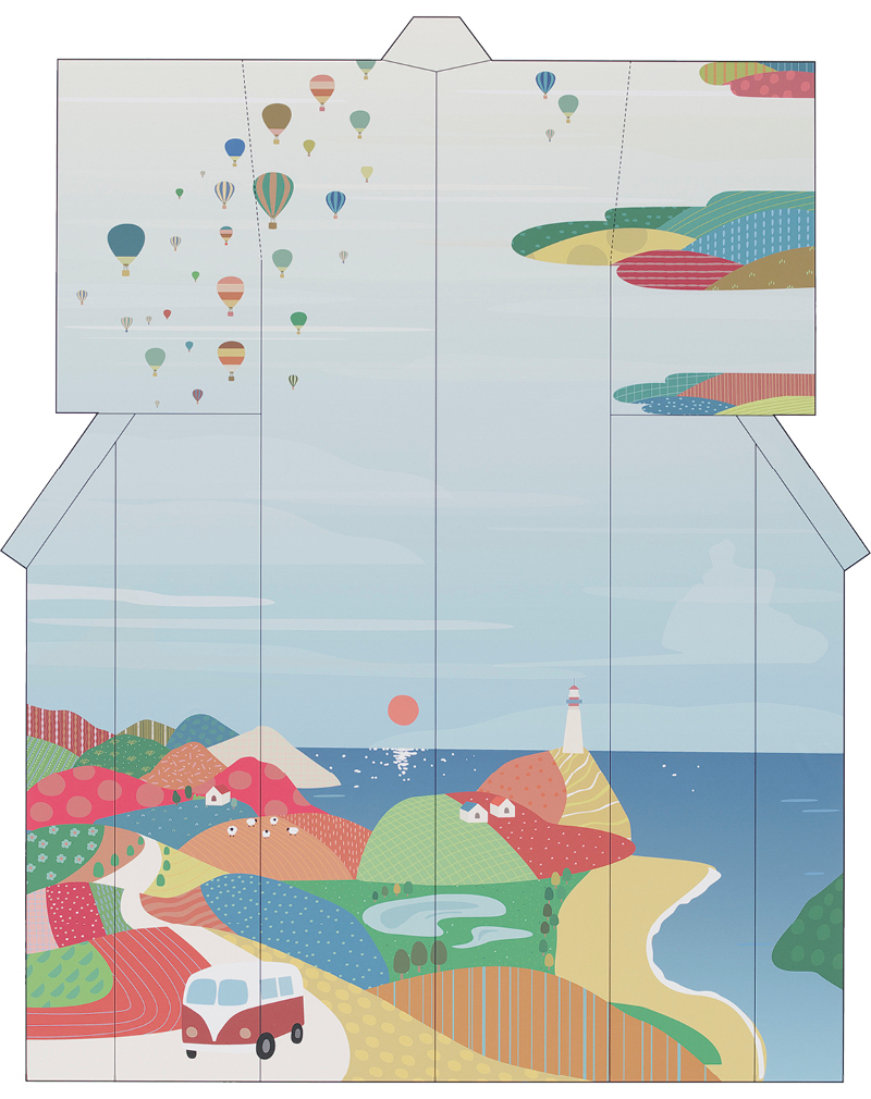 旅をテーマにデザインしました。カラフルな色合いで様々な景色を描き、旅をするときの楽しさや感動を表現しました。見る人も着る人も楽しめる着物になったと思います。
