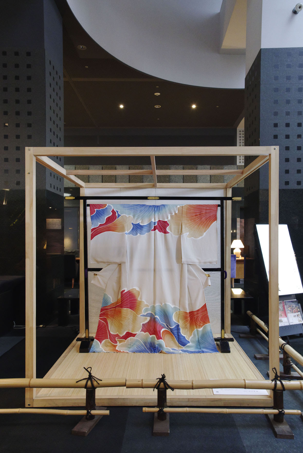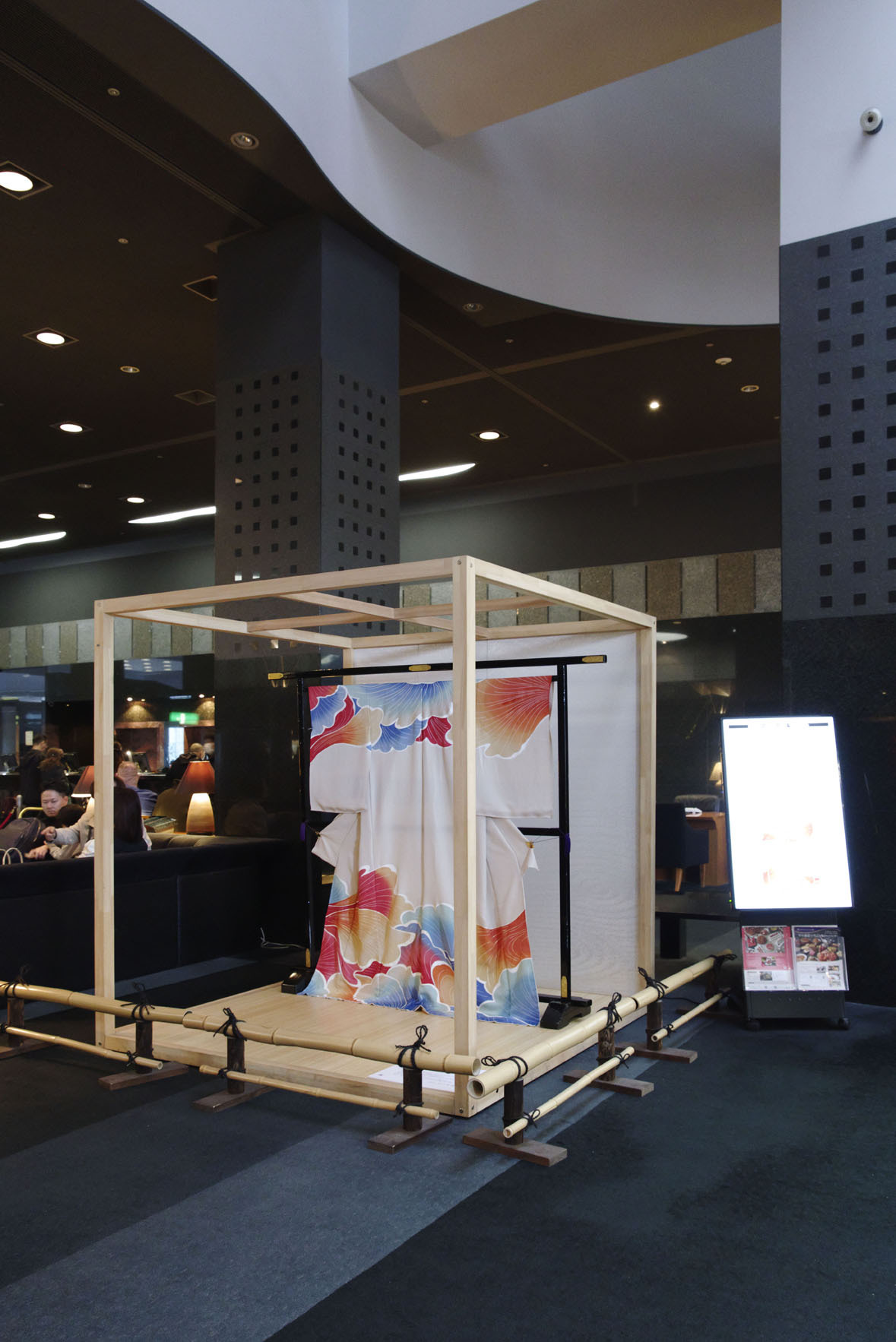 実制作された市長賞のきものを衣桁で展示した。サイネージで、主催者挨拶、市長賞作品について(森口実行委員長講評)、京都市長挨拶、制作工程画像を表示した。