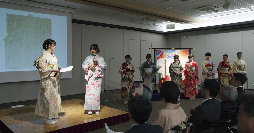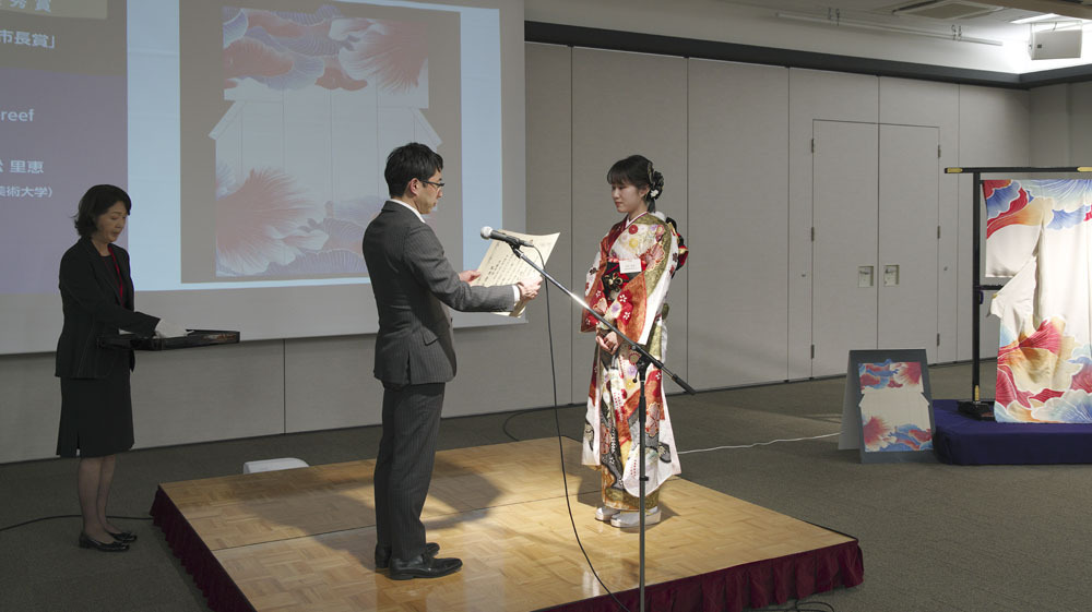 最優秀賞・京都市長賞作品の実制作工程画像をスクリーンに上映し、最優秀賞受賞者にきもの制作について、あわせて他の入賞者には入賞作についてのインタビューが行われた。