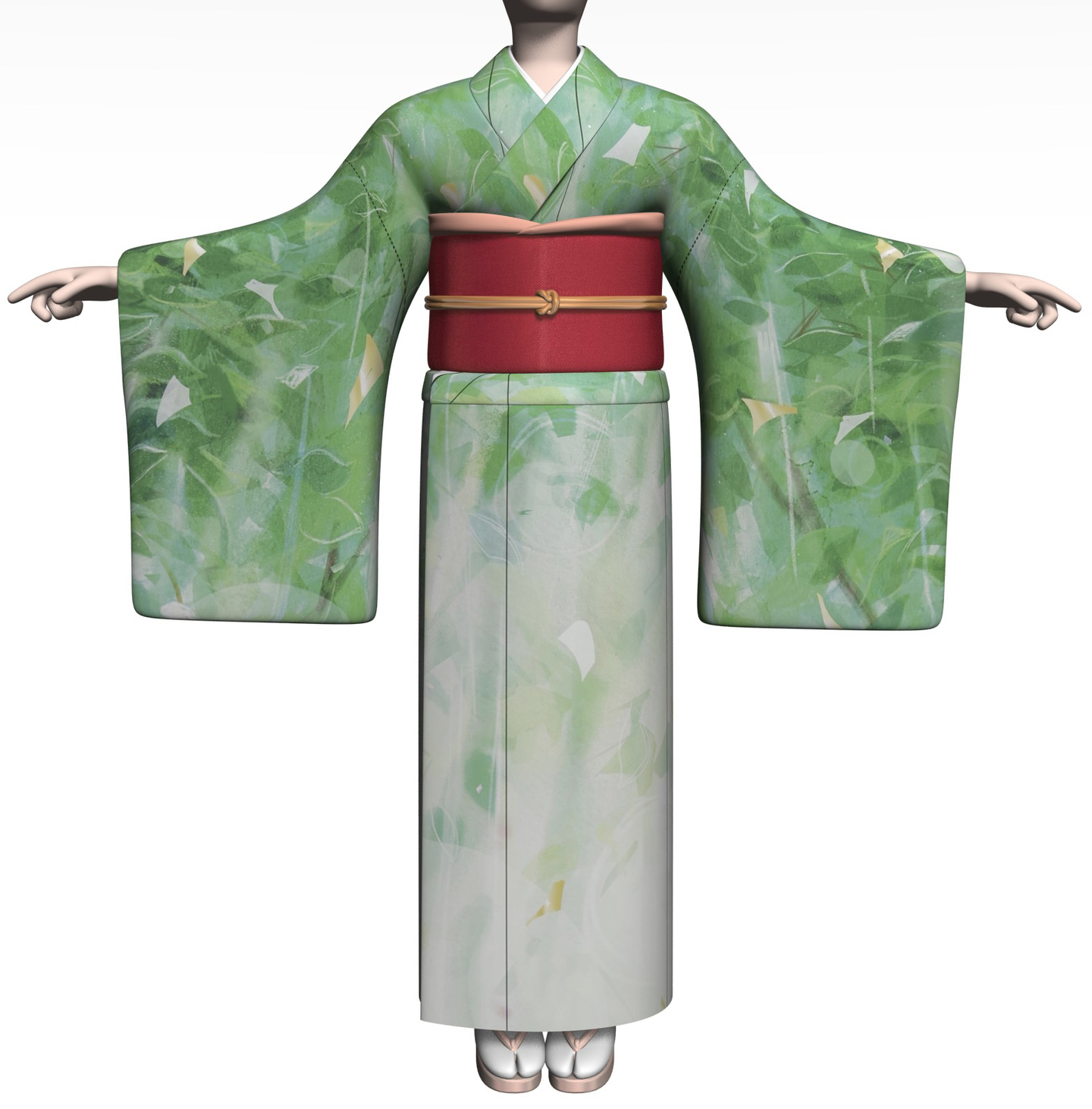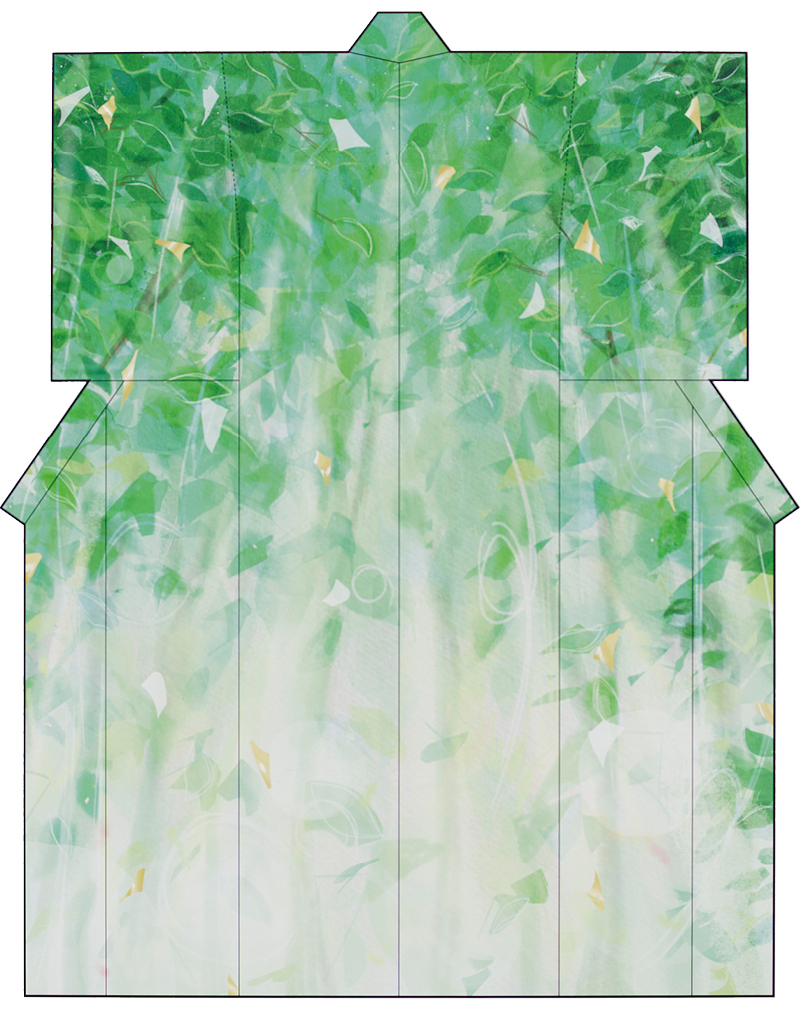 私は着物に「着る」よりも「包まれる」という印象があります。構造的な理由ですが、身に着ける時に優しい記憶を思い出すからです。そして、「包まれる」が合う情景を考えた時、木漏れ日揺れる森が浮かびました。その優しい様子が着物と重なったため、コンセプトにしました。水彩風に色を重ねることで葉の様子を、白・金を使って光を表現しています。着る人が思わず深呼吸したくなるような、優しい気持ちになるデザインしました。